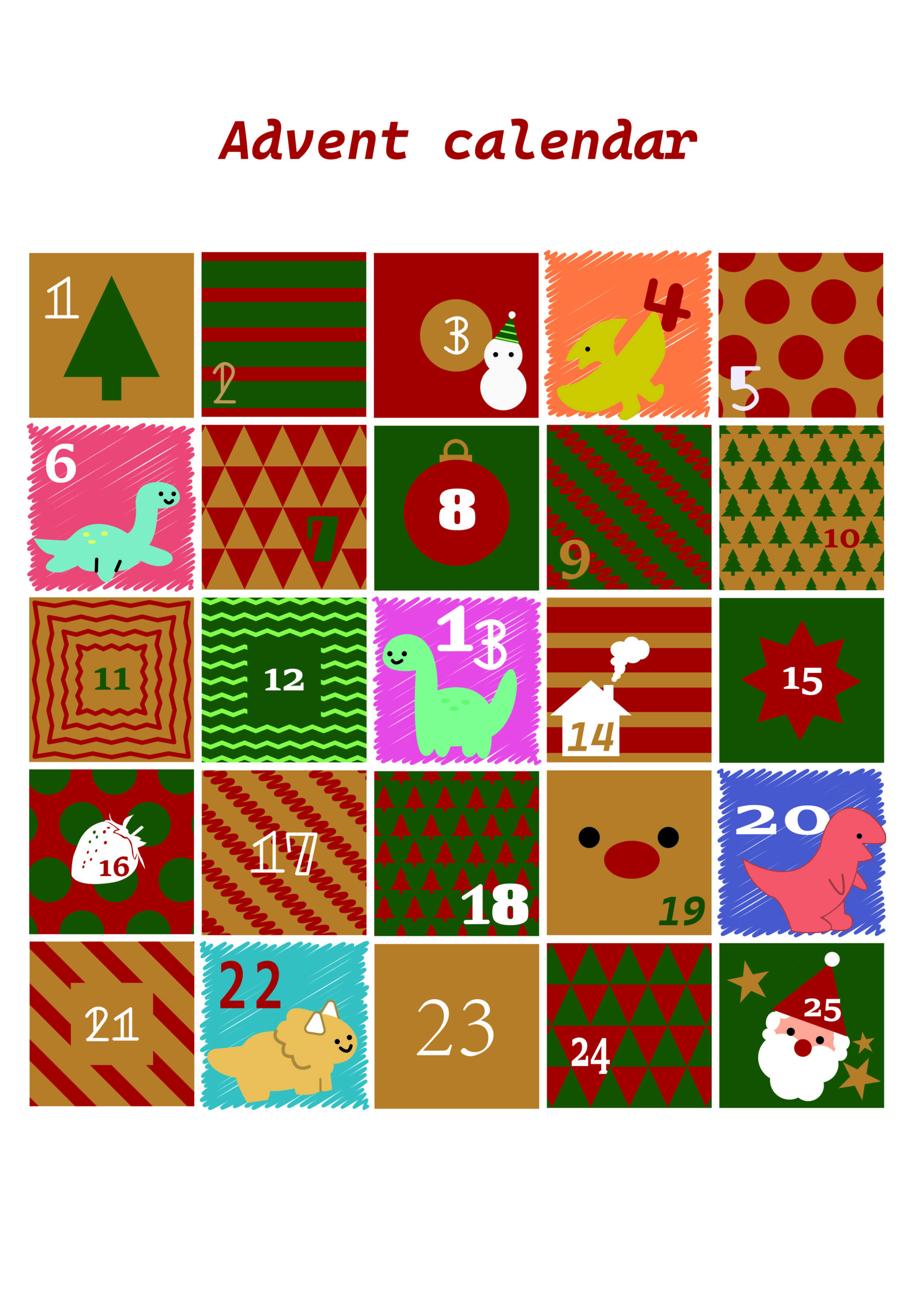 恐竜好きな4歳の姪っこ用に作成。数字がわかるようになってきたため、クリスマスまで1にち1にちを楽しみながら過ごせたらと思っています。
