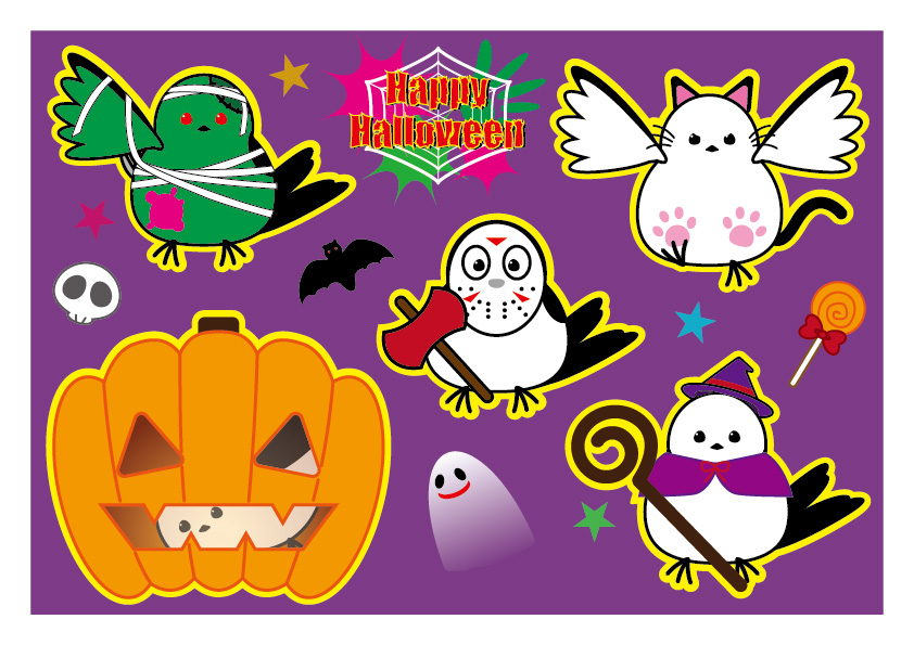 Adobe Illustrator ポストカード(ハロウィン) Adobe Illustrator 2025.12.23 コンセプト ハロウィン向けのポストカードを作成しました。可愛いものからちょっと怖いものまでシマエナガの可能性を試したいと思い、色々なパターンを作成しました。