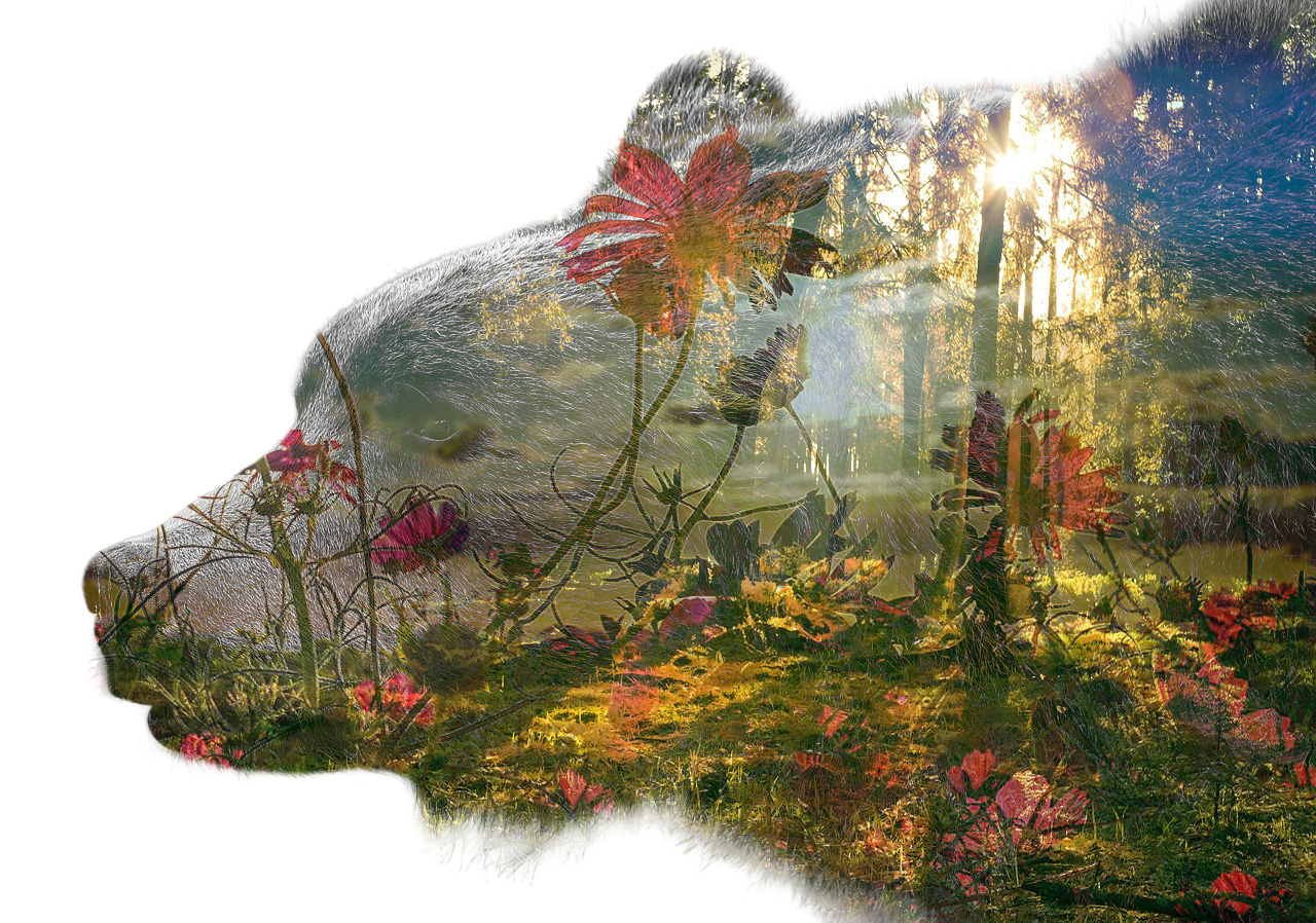 Adobe Photoshopコラージュ切り抜き合成未分類 デザイン いきるぼくら Adobe Photoshop 2026.02.07 多重露光を使い、ヒグマと自然の景色を重ねてみました。 レイヤー構成 調整レイヤー 1.ヒグマを切り抜き、背景透過 2.白黒にして 3.花や光、木を重ねる 4.好みの効果をつける 使用画像