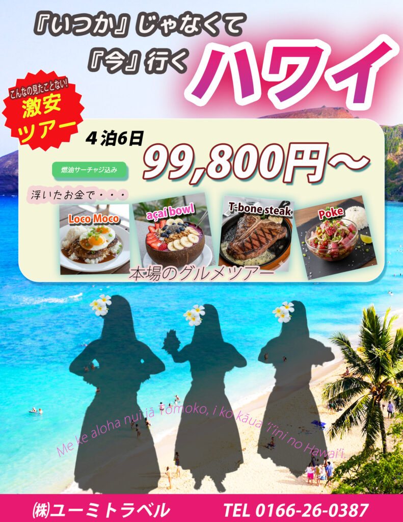 未分類 格安ハワイ予約チラシ 未分類 2026.02.27 テーマ 『いつか』と後回しにせず、『今』叶える 人はつい「いつか行きたい」と言いますが、その『いつか』は約束されていないかもしれない。 だからこそ、「今動こう」と思えるようなメッセージをこめました。