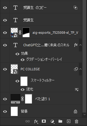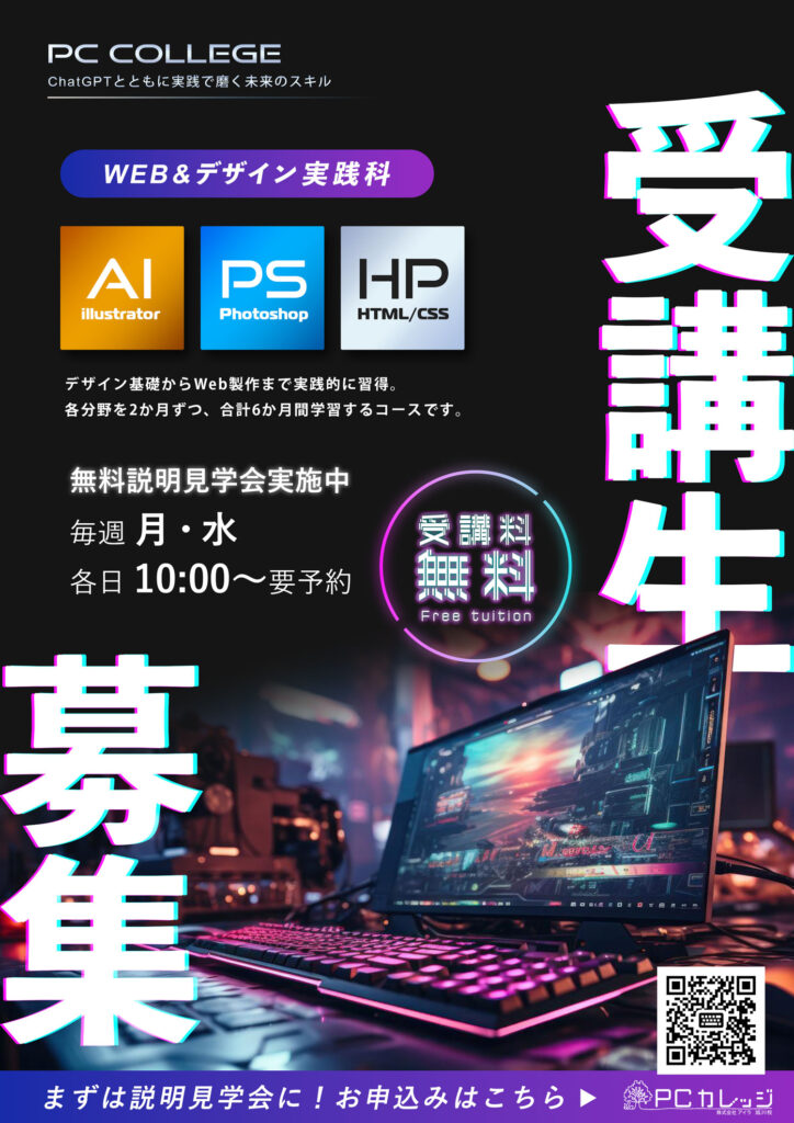 Adobe Photoshop合成広告 パソコン教室のチラシ Adobe Photoshop 2026.02.27 コンセプト ゲーミングPCの広告風にPCカレッジのチラシをイメージして作りました。 レイヤー構成