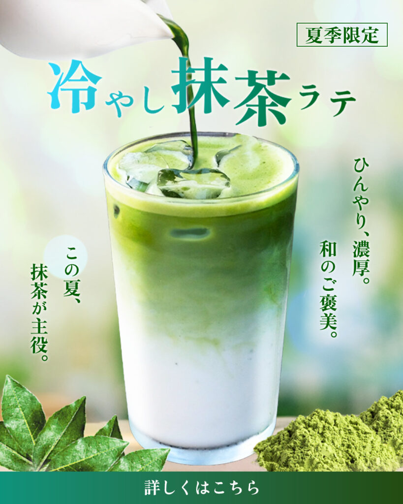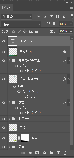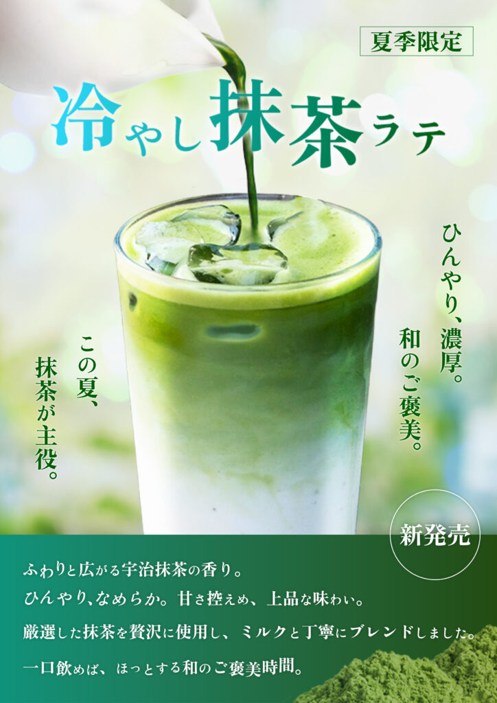 Adobe Photoshopバナー使用ソフト広告 夏季限定抹茶ラテバナー Adobe Photoshop 2026.02.27 コンセプト スイーツショップの新作ドリンク販促バナー レイヤー構成 チラシ・縦長、横長バナー