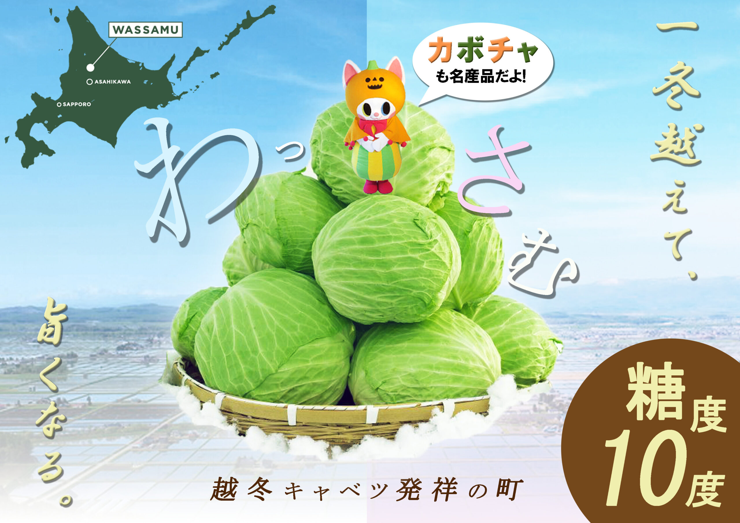 和寒町といえば、「越冬キャベツ」一冬越えて甘みを蓄えます。通常のキャベツは、糖度が6度前後のところ、「越冬キャベツ」は糖度が10度になるそう。背景は左から右へ、冬から春へイメージしました。季節の切り替わりに、マスコットクラクターの「かぼにゃ」と「越冬キャベツ」を置いて視線を誘導します。実は、カボチャも名産品だそう。いろいろ、欲張って詰め込もうとしましたが、意外とシンプルにまとめたほうが見栄えもよいのかもしれませんね。背景にグラデーションをかけてあげると途端にそれっぽくなりました。こう見ると、アクセントカラーも重要ですね。
