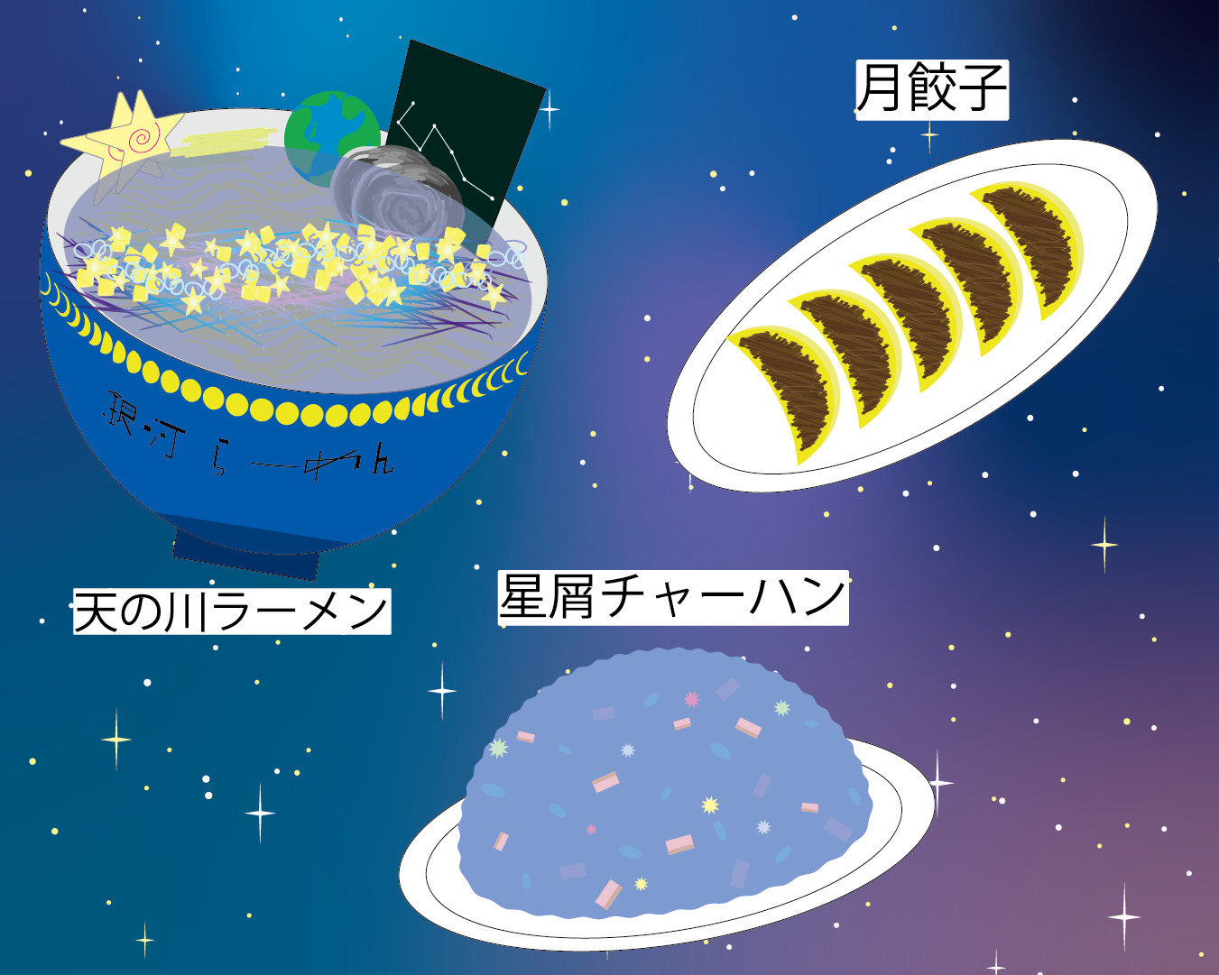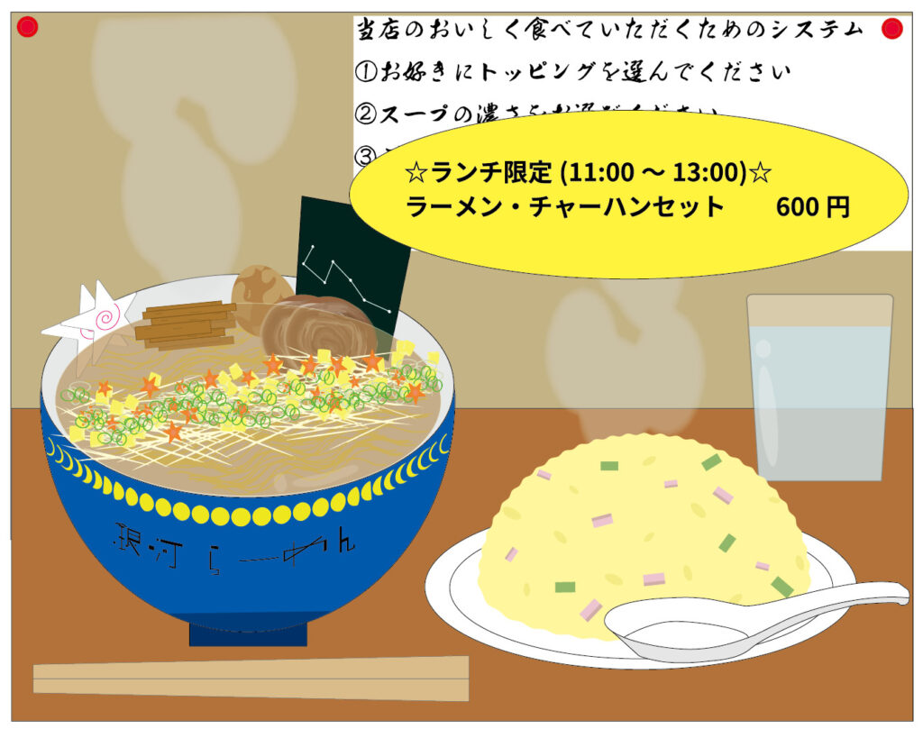 1枚目は。架空の店舗「銀河らーめん」で貼ってあるメニュー写真というイメージで作りました。