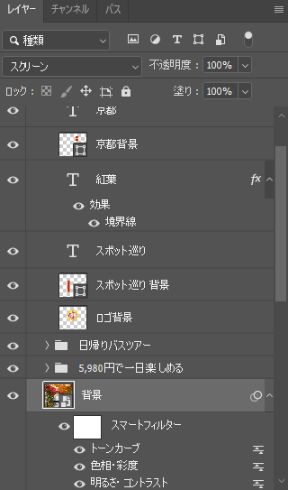 日本っぽさを出すために、文字の後ろには和柄をいれています。その上の金色の枠にも和紙のようなデザインを設定しています。また背景に使われているもみじの写真はより、鮮やかさを出すために、色調補正で彩度を上げております。